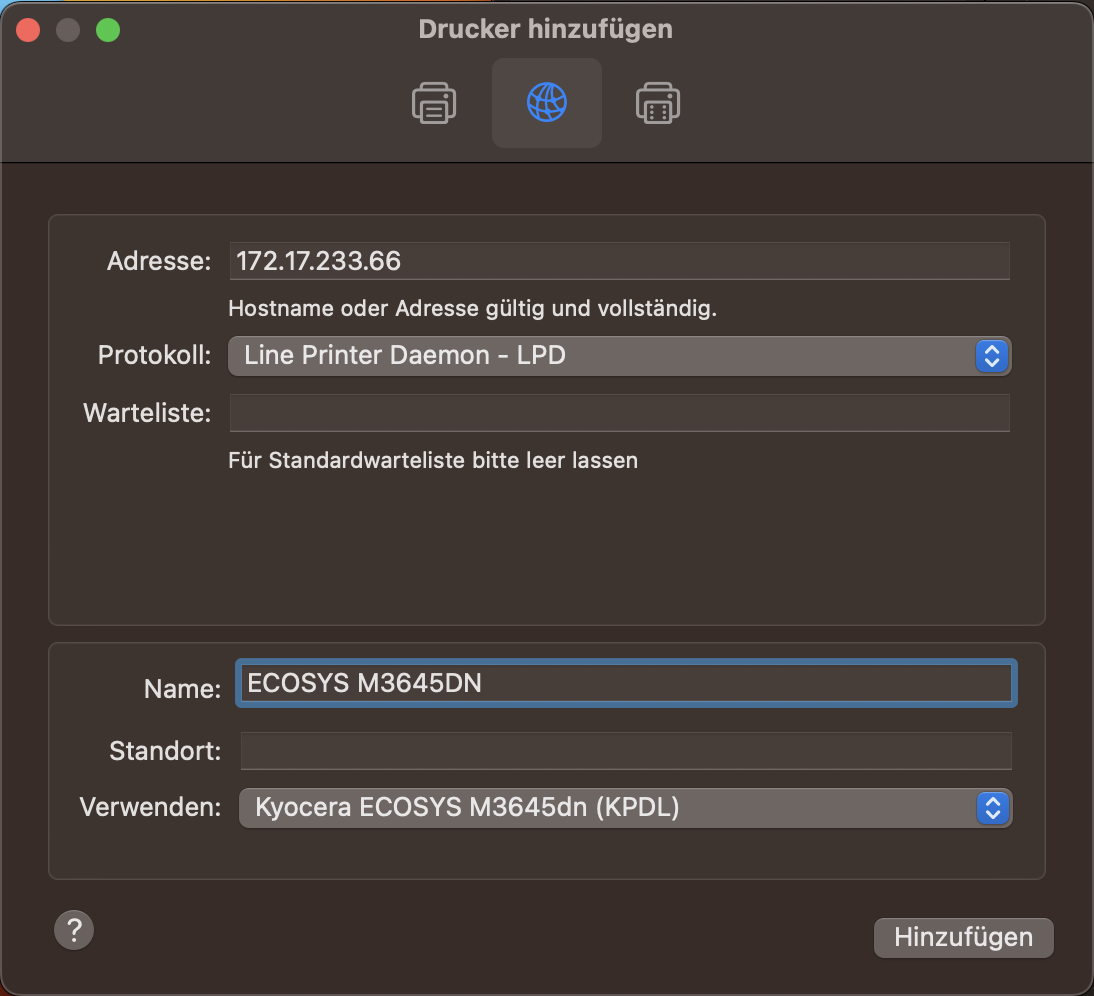 Please use the IP address of your printer as the address , which you can find on the machine’s status page.